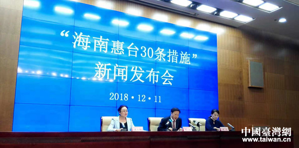 中國臺灣網12月11日海口訊 12月11日,在“海南惠臺30條措施”新聞發布會上,海南省發布了《中共海南省委統一戰線工作部 海南省發展和改革委員會 貫徹落實〈關于促進兩岸經濟文化交流合作的若干措施〉實施意見》(簡稱“海南30條惠臺措施”)!昂D30條惠臺措施”的出臺旨在深入貫徹黨的十九大精神和習近平總書記關于對臺工作重要論述,與臺灣同胞分享建設中國(海南)自由貿易試驗區、中國特色自由貿易港發展機遇,讓臺灣同胞在海南投資、創業、就業、學習和生活有更多的獲得感。