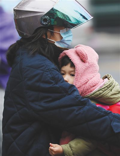 1月8日,海口街頭,一位小朋友依偎在大人懷中。