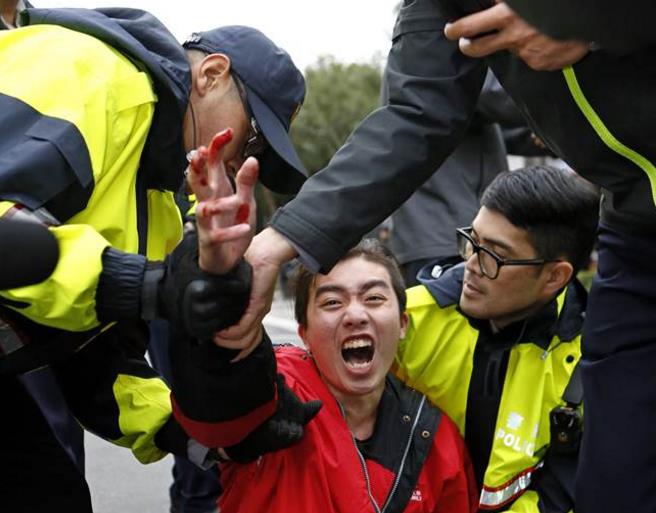 勞團成員發動突襲,其中3人翻過“立法院”大門遭警方以優勢人力制伏。(圖片來源:臺灣《中時電子報》)