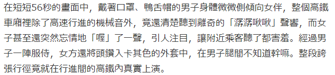 “旁邊還有學齡前的小孩耶!”爆料網友痛批這對男女實在太夸張,“一大早搭高鐵就遇到這種事!”整段畫面曝光后引起網友熱烈討論,直呼“高鐵漏水?”、“這不是公眾場合嗎?太扯”、“拜托去廁所處理好嗎?”!