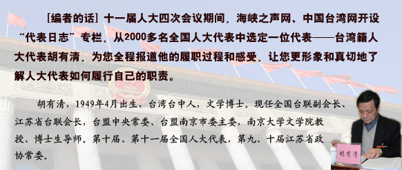 在下午的審議中,胡有清代表對加強涉臺案件審理,兩岸司法互助等提出自己的建議。他建議,一是要加大力度宣傳大陸涉臺法律法規,讓更多的臺灣同胞了解大陸的司法制度和具體的法律規定。同時也應該做好向大陸干部群眾的宣傳工作。二是做好涉臺案件案例的分析。多年來各級司法機關處理了大量的涉臺案件,通過對案例的分析,總結經驗、吸取教訓,對于改善工作有很重要的意義。三是涉臺司法工作應當加強與臺灣工作部門和有關人員的聯系。可以更多地發揮臺籍人大代表、政協委員的作用。某些地方嘗試性地讓臺商擔任人民陪審員等做法也可以進行總結、研究,在條件成熟時加以推廣。四是最高人民法院《關于審理涉臺民商事案件法律適用規定》當中強調了臺灣地區當事人的民商事訴訟法律地位。這個基本精神在我們的司法實踐當中,還應該進一步地加以落實。