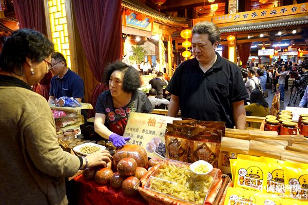 商戶向游客介紹臺(tái)灣特色柚子肉的功效。(中國(guó)臺(tái)灣網(wǎng) 高斯斯 攝)