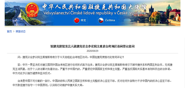 駐捷克使館發(fā)言人就捷克議會參議院主席赴臺灣地區(qū)訪問答記者問。(中國駐捷克大使館網(wǎng)站截圖)